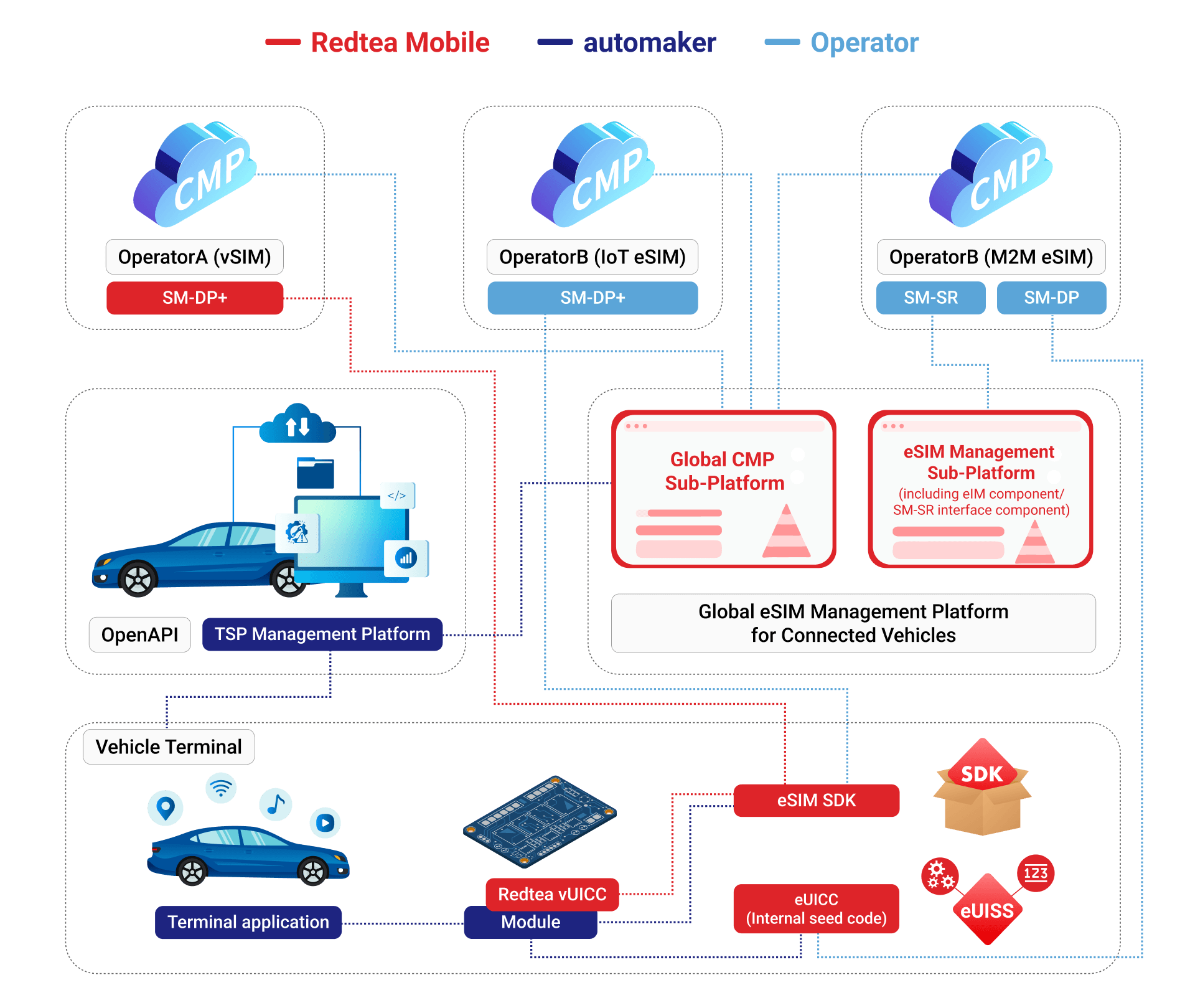 Redtea standardizes eSIM activation, entitlement and service provisioning across all operators, ensuring that in-vehicle UX and connected services behave consistently regardless of market or MNO differences.